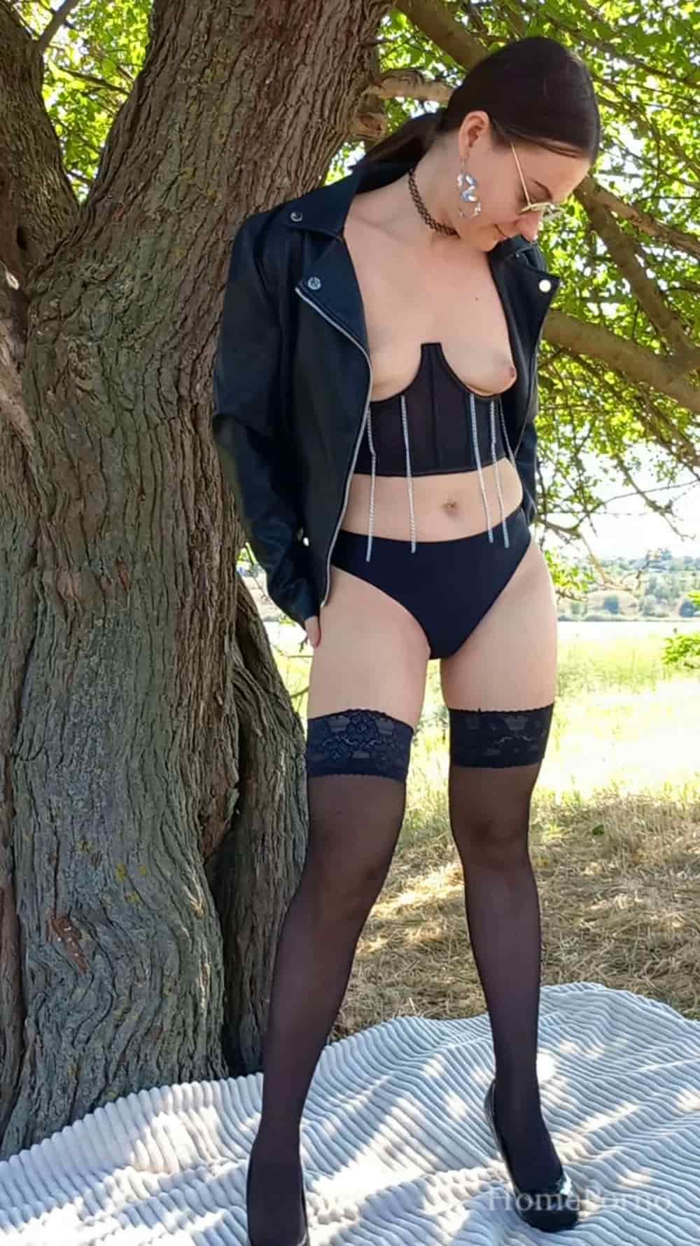 Красивая брюнетка эротично позирует на природе стоя под деревом и медленно снимая с себя одежду и белье светит своими прелестями