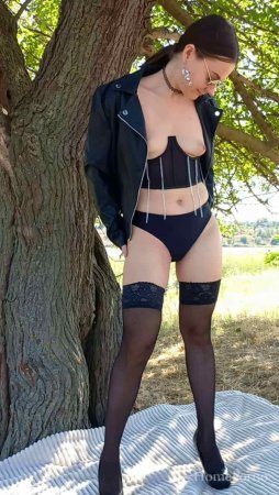 Красивая брюнетка эротично позирует на природе светя своими прелестями