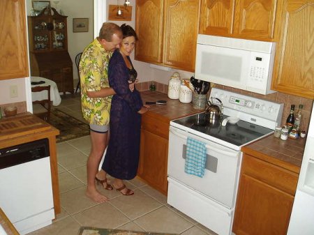 Зрелые супруги решили потрахаться и сделать несколько фото своего домашнего секса и не нашли места лучше чем заняться сексом на кухне. Зрелая жена приготовившись зашла на кухню и распахнула свой халат показала какое у нее красивое нижнее белье. Муж подойдя к жене снял с нее халат и нижнее белье поставил жену раком и вылизав ей пизду вставил свой торчащий упругий член в мокрую вагину своей зрелой жены. Выебав жену на кухне муж дал ей пососать хуй и кончил жене на лицо и на ее красивую грудь.