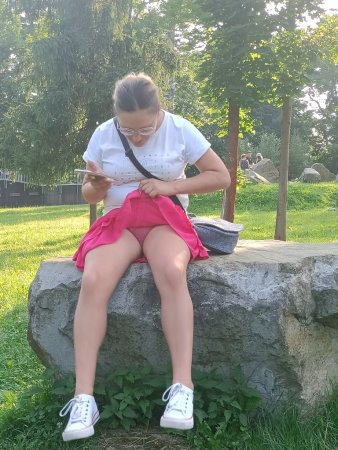 Жена гуляя в парке села на камень и задрав платье показала свои прозрачные трусики сквозь которые можно было увидеть ее голую пизду но она стащив трусики показывает свою голую киску на публике в парке